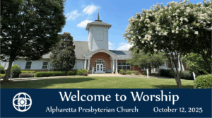 Alpharetta Presbyterian Church> Worship & Music> Worship Services> Livestream> Worship & Music Worship Services Music & Choirs Livestream Spanish Congregation Calendar of Events Documents and Forms Livestream Sunday, October 12, 2025 11amRev. Dr. Beverly MarkhamYouTube livestream link Sunday, October 5, 2025 10:30amWorld Communion SundayYouTube livestream link Sunday, September 28, 2025 11:00amDr. Ollie WagnerYouTube livestream link Sunday, September 21, 2025 11:00amDr. Ollie WagnerYouTube livestream link Sunday, September 14, 2025 11:00amOpen Arms SundayYouTube livestream link Sunday, September 7, 2025 11:00amRev. Dr. Ollie WagnerYouTube livestream link Sunday, August 31, 2025 11:00amRev. Dr. Ollie WagnerYouTube livestream link Sunday, August 24, 2025 11:00amRev. Dana AbuGhazalehYouTube livestream link Sunday, August 17, 2025 11:00amRev. Dr. Ollie WagnerYouTube livestream link Sunday, August 10, 2025 11:00amRev. Dr. Ollie WagnerYouTube livestream link Sunday, August 3, 2025 11:00amRev. Dr. Ollie WagnerYouTube livestream link