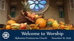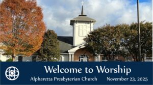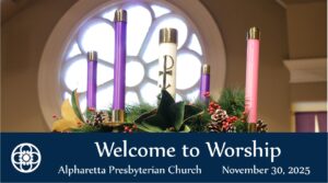 Alpharetta Presbyterian Church> Worship & Music> Worship Services> Livestream> Worship & Music Worship Services Music & Choirs Livestream Spanish Congregation Calendar of Events Documents and Forms Livestream Sunday, November 30, 2025 11am 1st Sunday of AdventRev. Dana AbuGhazalehYouTube livestream link Sunday, November 23, 2025 11amRev. Dr. Ollie WagnerYouTube livestream link Sunday, November 16, 2025 11amRev. Dr. Ollie WagnerYouTube livestream link Sunday, November 9, 2025 11amRev. Dana AbuGhazalehYouTube livestream link Sunday, November 2, 2025 11amRev. Dr. Ollie WagnerYouTube livestream link Sunday, October 26, 2025 11am All Saints ObservedRev. Dr. Ollie WagnerYouTube livestream link Sunday, October 19, 2025 11amRev. Dr. Ollie WagnerYouTube livestream link Sunday, October 12, 2025 11amRev. Dr. Beverly MarkhamYouTube livestream link Sunday, October 5, 2025 10:30amWorld Communion SundayYouTube livestream link Sunday, September 28, 2025 11:00amDr. Ollie WagnerYouTube livestream link Sunday, September 21, 2025 11:00amDr. Ollie WagnerYouTube livestream link Sunday, September 14, 2025 11:00amOpen Arms SundayYouTube livestream link Sunday, September 7, 2025 11:00amRev. Dr. Ollie WagnerYouTube livestream link Sunday, August 31, 2025 11:00amRev. Dr. Ollie WagnerYouTube livestream link Sunday, August 24, 2025 11:00amRev. Dana AbuGhazalehYouTube livestream link Sunday, August 17, 2025 11:00amRev. Dr. Ollie WagnerYouTube livestream link Sunday, August 10, 2025 11:00amRev. Dr. Ollie WagnerYouTube livestream link Sunday, August 3, 2025 11:00amRev. Dr. Ollie WagnerYouTube livestream link